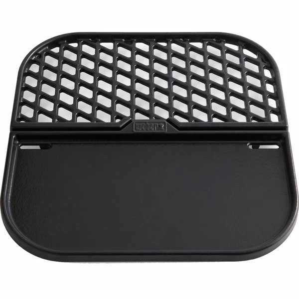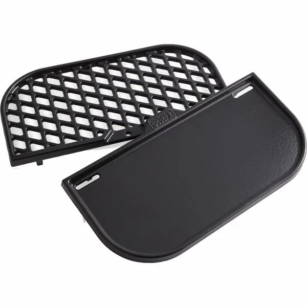 Stek läckra biffar och tillaga saftiga grönsaker på Webers smarta gjutjärnsduo, som är både en grillplatta och galler i ett. Plattan kan vikas ihop för enkel förvaring när den inte används, och den är enkel att rengöra tack vara porslinsemaljeringen. Emaljen garanterar även att maten inte bränner fast, vilket gör att det inte behövs så mycket stekfett.