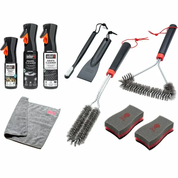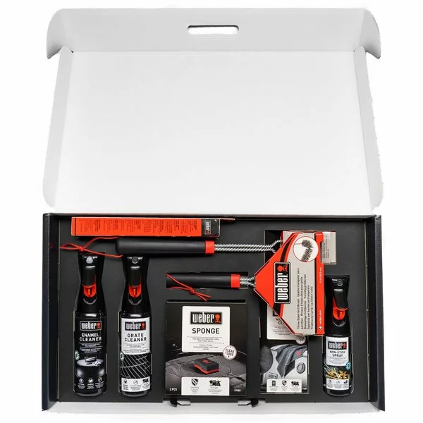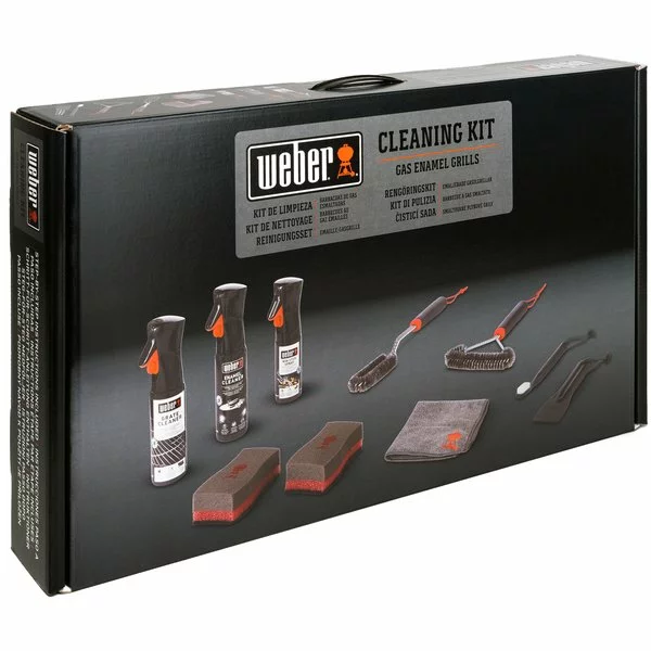 Ett rengöringskit från Weber, specialdesignat för att rengöra gasolgrillar med emaljerade lock. Här får du allt du behöver för att hålla din grill i toppskick och skinande ren. Kitet innehåller borstar, rengöringsmedel, svamp, trasa och non-stick-spray. Det ingår en rengöringsmanual och samtliga produkter är praktiskt packade i ett samlat set som gör det lätt att komma igång.